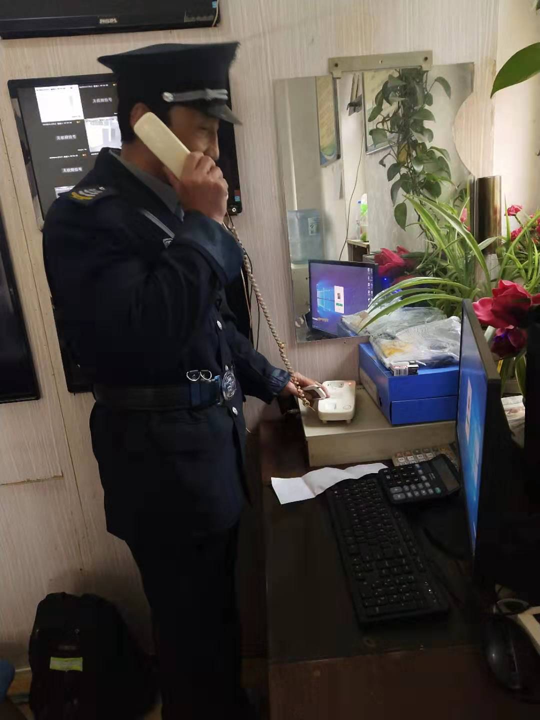 4、维保人员赶赴现场用保安室对讲与电梯被困人员取得联系,对被困人员进行安抚,告知注意事项,耐心等待救援。